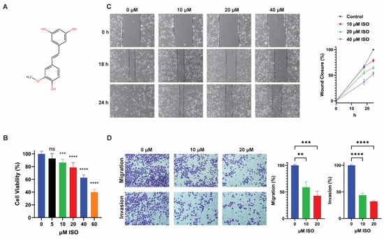 ISO is a stilbene derivative with a similar chemical structure to resveratrol (Figure 1A). To examine the effects of ISO on cell viability, we performed the MTS assay in T24 cells treated with varying doses of ISO (0, 5, 10, 20, 40, and 60 μM) for 24 h. ISO treatment reduced cell viability in a dose-dependent manner, as evidenced by a gradual decrease from 92.6% at 5 μM to 40.1% at 60 μM, with significant changes starting from 10 μM compared to the untreated control (Figure 1B). Next, the effects of ISO on cell migration were assessed using the scratch wound healing assay. As shown in Figure 1C, ISO-treated cells displayed delayed wound healing at 24 h, with ISO treatment at 10, 20, and 40 μM doses eliciting 82.4%, 68.6%, and 54.4% wound closure, respectively, compared to full closure (100%) in the untreated control. Moreover, transwell assays confirmed that ISO inhibited both migration and invasion of T24 cells (Figure 1D). When treated with 10 and 20 µM ISO, T24 cell migration was reduced to 58.8% and 42.7%, while cell invasion declined to 43.9% and 32.1%, respectively, compared to those in the untreated controls (Figure 1D). Collectively, these results demonstrated that ISO inhibits human bladder cancer progression via suppressing cancer cell survival, migration, and invasion.