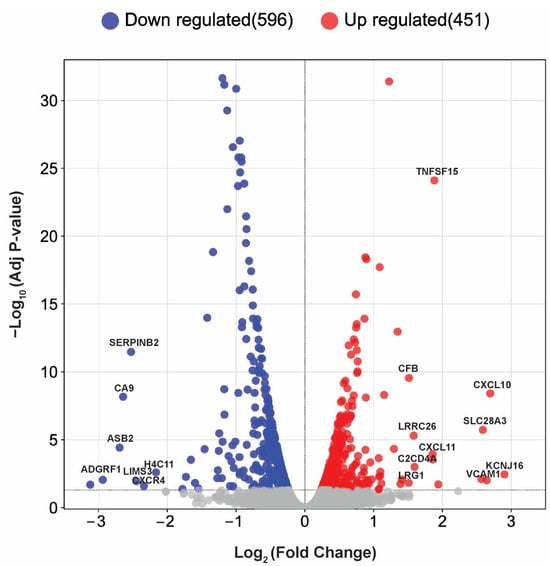 RNA-sequencing was performed on T24 cells treated with or without 20 µM of ISO for 24 h. A total of 1048 differentially expressed genes (DEGs) were identified between the treatment and control group, of which 596 were downregulated and 451 were upregulated (Figure 2; Supplemental Table S1). The top 20 significantly altered genes, including the 10 most downregulated genes (KCNK3, ADGRF1, ASB2, CA9, SERPINB2, LIMS3, IGFBP3, CXCR4, H4C11, F3) and 10 most upregulated genes (KCNJ16, CXCL10, CDRT4, SLC28A3, VCAM1, TNFSF15, CXCL11, C2CD4A, LRRC26, CFB, LRG1) are listed in Table 1.