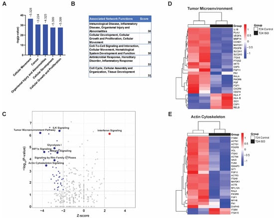 Ingenuity Pathway Analysis (IPA) of top diseases and biological functions, networks, and canonical pathways related to DEGs. (A) Bar graph of the −log p-values for top diseases and biological functions associated with DEGs. The Z-score of each pathway is displayed above each bar. (B) List of top associated network functions associated with DEGs. The score represents the network score. (C) Volcano plot of significant canonical pathways enriched in DEGs (p < 0.05 and Z-score > 2). Blue dots represent downregulated and red dots represent upregulated canonical pathways. Grey dots are not significant canonical pathways. The X-axis depicts the Z-score, and the Y-axis shows −log10 p-values. (D,E) Heatmap showing DEG profile of tumor microenvironment (D) and actin cytoskeleton (E) genes in ISO-treated and control T24 cells.