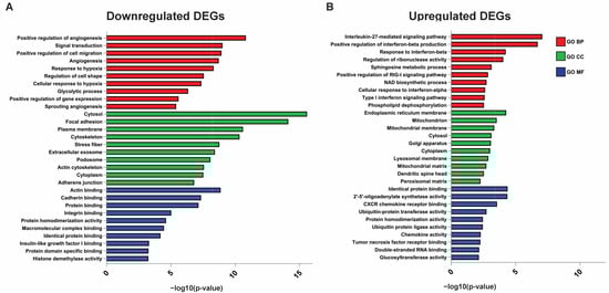 Gene Ontology (GO) enrichment analysis on all DEGs between control and ISO-treated T24 cells. Top enriched biological processes (BPs), cell components (CCs), and molecular functions (MFs) of downregulated (A) and upregulated (B) DEGs. GO terms were ranked by −log10 (p-value).
