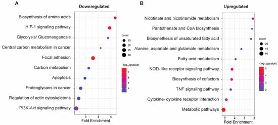 Top KEGG pathways that were enriched in ISO-downregulated genes were Biosynthesis of amino acids (p-value = 5.59 × 10−7), HIF-1 signaling pathway (p-value = 1.67 × 10−8), Glycolysis/Gluconeogenesis (p-value = 3.32 × 10−5), Central carbon metabolism in cancer (p-value = 2.51 × 10−4), Focal adhesion (p-value = 2.60 × 10−8), Regulation of actin cytoskeletons (p-value = 3.51 × 10−4), and PI3K-Akt signaling pathway (Figure 5A). In upregulated genes, top KEGG pathways included Nicotinate and nicotinamide metabolism (p-value = 2.42 × 10−4), Pantothenate and CoA biosynthesis (p-value = 0.015), Biosynthesis of unsaturated fatty acid (p-value = 0.0043), Alanine, aspartate, and glutamate metabolism (p-value = 0.013), and Fatty acid metabolism (p-value = 0.014) (Figure 5B). Other cancer-related KEGG terms such as Metabolic pathways (p-value = 5.90 × 10−6), Cytokine–cytokine receptor interaction (p-value = 3.0 × 10−3), and TNF signaling pathway (p-value = 7.03 × 10−3) were also enriched in ISO-upregulated genes, which was consistent with our GO analysis (Figure 4B and Figure 5B). Thus, KEGG pathway analyses demonstrated that ISO targets the metabolic reprogramming of bladder cancer and induces substantial changes in major metabolic pathways, which subsequently impedes cancer cell survival, migration, and invasion.