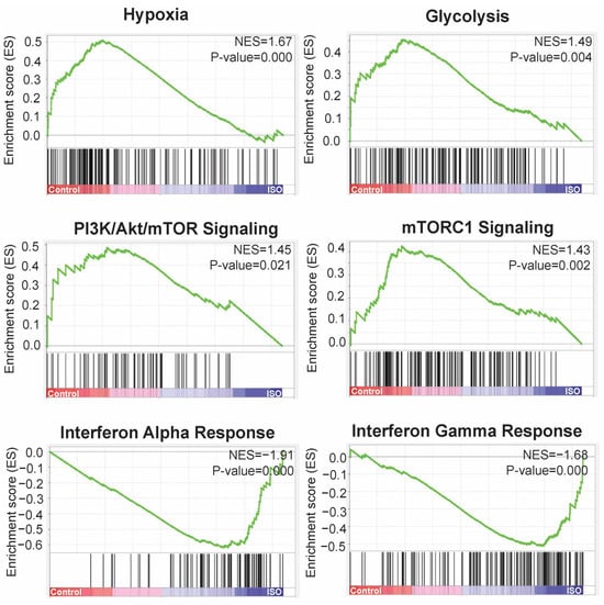 Gene set enrichment analysis (GSEA) was performed to analyze the coordinated changes of the Hallmark gene set (MsigDB, Broad Institute) [] between ISO-treated and untreated control samples. Results showed that 6 out of 50 hallmarks were significantly enriched (Figure 6). Hypoxia (NES = 1.67, FDR q = 0.030, p = 0.000), Glycolysis (NES = 1.49, FDR q = 0.121, p = 0.004), PI3K/Akt mTOR Signaling (NES = 1.45, FDR q = 0.139, p = 0.021), and mTORC1 Signaling (NES = 1.43, FDR q = 0.119, p = 0.002) were highly enriched in untreated control samples, whereas Interferon Alpha Response (NES = −1.91, FDR q = 0.001, p = 0.000) and Interferon Gamma Response (NES = −1.68, FDR q = 0.014, p = 0.000) were robustly enriched in ISO-treated samples (Figure 6). Consistent with the findings from the functional annotation and pathway analysis, the GSEA analysis indicated that ISO treatment, compared to the untreated controls, induced the expression of genes related to the inflammatory response and suppressed those involved in metabolic reprogramming.