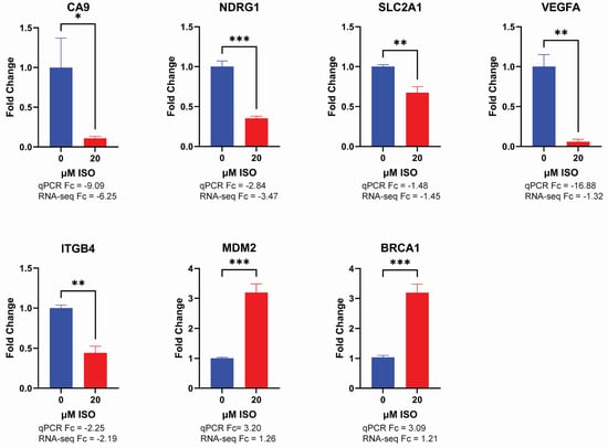 Validation of gene expression by quantitative real-time PCR. Relative mRNA expression levels of CA9, NDRG1, SLC2A1, VEGFA, ITGB4, MDM2, and BRCA1 were analyzed in T24 cells treated with ISO for 24 h or untreated control cells. Gene expression was normalized relative to the expression of β-Actin and presented as fold change to the levels of untreated control cells. Fold changes of each gene from qPCR and RNA-seq were listed. Data are presented as mean ± SD (n = 3). Significance was determined using an unpaired t-test. * p < 0.05, ** p < 0.01, *** p < 0.001.