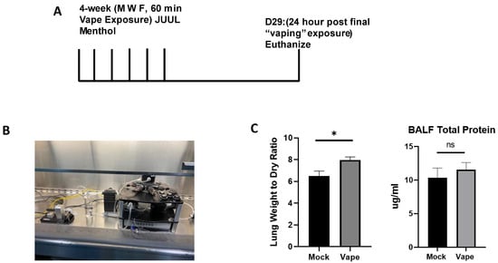 A challenge with investigating the toxicity and biological effects of vaping resides with the exposure model itself. E-liquids must be quickly heated to a vaporization temperature (approximately 250–300 °C) and drawn in by the user into the pulmonary tract. Prior exposure models used either vape condensate dropwise intranasal [,] or intratracheal exposure or whole body vapor exposure [], which are riddled with complexities that defray their biological relevance. To establish a more biologically relevant vaping model, we utilized the SCIREQ InExpose compact inhalation system/“vape tower” to simulate airway vaping in a nose-only exposure mouse model (Figure 1B). Previous research has shown that an inhaled e-liquid aerosol model offers a more accurate model for cytotoxicity assays as opposed to a condensed e-liquid model [,], while not exposing extraneous mucosal sites or skin/fur, which would allow the e-liquid to be orally ingested. During our initial exposure, the mice were vaped for 4 weeks (Figure 1A). Afterwards, the mice were humanely sacrificed, and lungs were collected. The lung wet/dry ratio (a well-described clinical measure of pneumonia/pulmonary inflammation) demonstrated significant changes when comparing the vape group to the mock group (Figure 1C). When investigating total protein using BCA, a significant difference between the mock and vape was not demonstrated (Figure 1C). These data suggest that even after only 4 weeks of vaping alone, slight but significant negative effects on lung health are clearly observable as lungs exposed to vaping had an increase in weight due to fluid and/or inflammatory cells, which are hallmarks of pulmonary exacerbation [].