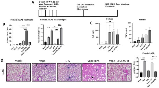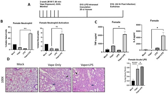Acute vaping in vivo model shows vaping exacerbates lung cellularity and inflammation in the presence of infection. (A) Mouse model for acute vaping using the SCIREQ InExpose system. (B) Bronchoalveolar lavage fluid (BALF) was collected from mice, and cells and supernatant were separated by centrifugation. Cells were stained using antibodies for neutrophils and macrophages as well as their activation. The LPS group has lower neutrophil content and activation when compared to mock and vape alone groups. Vape + LPS groups have a higher neutrophil content and activation, indicating vaping plus infection (LPS) leads to increased cell response (** p < 0.01. ns = not significant). (C) BALF supernatant was evaluated for the abundance of TNF-α and IL-6 using ELISA. Female mice have higher levels of IL-6 and TNF-α. Vaping also appears to have an increased effect on IL-6 and TNF-α in the presence of LPS. Symbols and bars represent the mean ± SEM compared to the mock infected group (* p < 0.05, **** p < 0.001). (D) H&E staining of lung sections demonstrate alveolar wall thickening and increased neutrophilia in vape and vape + LPS groups when compared to the mock group. Alveolar wall thickening is indicated by black arrows while neutrophils are indicated by blue arrows. Lung damage was quantified using a lung injury scoring method. Significant increases in vape alone vs. mock as well as vape + LPS vs. vape are evident (mag = 100×).