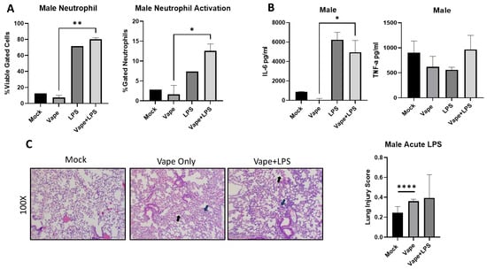 To investigate if disease burden is similar in males as in females, we vaped age-matched male mice for two weeks and then exposed them to LPS for 24 h. Post-infection animals (24 h) were sacked, and BALF and lungs were collected. Our flow cytometry analysis demonstrated a significant increase in neutrophil numbers observed in the vape + LPS group compared to the vape alone, which is similar to our female mice. However, this significance was not observed in LPS alone compared to vape + LPS (Figure 4A). Notably LPS alone and vape + LPS had higher neutrophil content and activation compared to the mock and vape, most likely due to the presence of infection. Significant differences in neutrophil activation were also observed between these two groups. Compared to females, the male mice appear to have slightly higher neutrophil numbers and activation (Figure 3). TNF-α and IL-6 levels were also investigated as described previously. A significant increase in IL-6 was observed in the vape + LPS group compared to vape alone group but not compared to LPS alone. However, no significant changes in TNF-α levels were detected (Figure 4B). The vape alone and LPS alone groups appeared to have less TNF- α activation while vape + LPS treatment resulted in more activation (though not statistically significant when compared to the mock group). When compared to the female data, it appeared that the male LPS treatment group had higher IL-6 levels while female mice displayed higher TNF-α levels. However, a similar result was not evident for the vape + LPS groups. Finally, H&E staining of lung sections demonstrated increased alveolar wall thickening and neutrophilia in the vape and vape + LPS groups (Figure 4C). The lung injury scoring data indicated a significant increase in damage with the vape alone lungs compared to the mock lungs. The males demonstrated no significant difference in the presence of LPS. However, when comparing the histopathology data, females appeared to have a worsened disease burden when vaped and challenged with only LPS (Figure 3D).