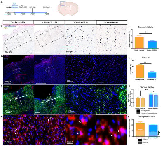 NWL283 administration leads to neuroprotection following stroke. (A) Schematic of experimental design. Box represents the region of cortical stroke on schematic coronal section. (B) Stroke+vehicle and stroke+NWL283 tissue sections stained for cleaved caspase-3 (CC3) and hematoxylin. Dashed line indicates the centre of the stroke lesion. CC3+ cells (arrows) were counted in the dashed box surrounding the stroke core. (C) CC3 expression was significantly reduced in NWL-treated mice following stroke. * p < 0.05, Student’s t-test. n = 7–9 mice/group; data represent mean ± SEM. (D) TUNEL+ cells were quantified in the dashed box within the stroked cortex. (E) Significantly fewer TUNEL+ cells were observed in NWL treated mice ** p < 0.01, Student’s t-test. Data represent mean ± SEM, n = 4 mice/group. (F,G) NeuN+ neurons were counted 250 µm medial and lateral to the stroke core (lesion) and in the perilesional area (250–500 µm from the stroke core). Stroke+vehicle mice had significantly fewer NeuN+ neurons in the lesion and perilesional area compared to stroke+NWL283 mice. * p < 0.05; Two-way ANOVA, Bonferroni post hoc. n = 6 mice per group; data represent mean ± SEM. (H) The number of Iba1+ microglia (arrows) were assessed based on their morphology and categorized as reactive microglia (extending <1 process from the cell body, ameboid; open arrow) or as homeostatic microglia (two or more processes, ramified; closed arrow). (I) Stroke+vehicle mice exhibited similar levels of ameboid and ramified microglia. NWL283 treatment reduced the number of reactive ameboid microglia compared to ramified microglia at PSD3. * p < 0.05; Student’s t-test. n = 3; mean ± SEM.