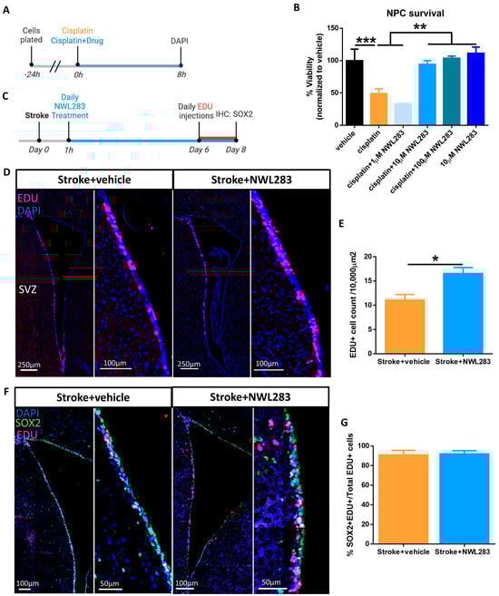 NWL283 prevents neural precursor cell death. (A) Schematic of cell culture plating and treatment time points. (B) Cisplatin led to a significant loss of NPCs at 8 h. In the presence of ≥10 µm NWL283 no NPC cell death was observed. ** p < 0.01, *** p < 0.001, One-way ANOVA, Tukey’s post hoc. n = 3 independent experiments; data represent mean ± SEM. (C) Schematic of experimental design. (D) Representative images of EDU labelled cells within the SVZ of stroke+vehicle- and stroke+NWL28-treated mice. (E) The number of EDU+ cells in the SVZ increased with NWL283 administration. * p < 0.05, Student’s t-test. n= 3–4 mice per group; data represent mean ± SEM. (F,G) Proliferating NPCs (EDU+SOX2+ cells) account for the vast majority of EDU+ cells (>90%) in both stroke+vehicle- and stroke+NWL283-treated mice. NWL283 promotes survival of endogenous NPCs post-stroke. n = 3–4 mice per group; data represent mean ± SEM.