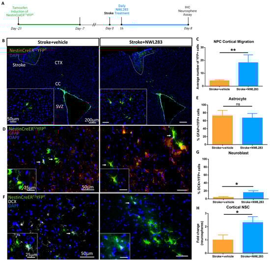 Under baseline conditions, NPCs are confined to the SVZ (Figure S4). Following stroke, NPCs migrate through the corpus callosum and into the ipsilateral stroked cortex towards the injury site [,]. Previous work has shown that migrating NPCs do not survive at the stroke injury site []. To determine if NWL283 enhanced the migration and/or survival of NPCs in the stroke-injured cortex, we performed lineage tracking in NestinCreERT2YFPfl reporter mice that enabled permanent labelling of Nestin+ NPCs in the SVZ prior to stroke and subsequent tracking of YFP+ NPCs and their differentiated progeny. Mice received TAM chow to label NPCs (YFP+) and were divided into stroke+vehicle or stroke+NWL283 groups (Figure 3A). The numbers of YFP+ NPCs (derived from the SVZ) were counted within the ipsilateral stroke-injured hemisphere on PSD8. As shown in Figure 3B, YFP+ cells were found in the corpus callosum and the stroke-injured cortex. Quantification revealed a significant 4.3-fold increase in YFP+ cells in the parenchyma of stroke+NWL283-treated mice compared to stroke+vehicle-treated mice (stroke+vehicle = 4.22 ± 0.66 vs. stroke+NWL283 = 18.25 ± 6.04, YFP+ cells) (p = 0.013) (Figure 3C) on PSD8. Hence, NWL283 increased the number of SVZ-derived NPCs in the parenchyma of the stroke-injured hemisphere.