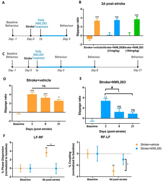 NWL283 improves functional outcomes following stroke. (A) Schematic of experimental timeline. (B) Stroke+vehicle and stroke+NWL283 mice had increased slippage ratios at PSD3, irrespective of NWL283 dose. *** p < 0.001, two-way ANOVA, Sidak post hoc. Stroke+vehicle; n = 7 mice Stroke+NWL283 (21 mg/kg); n = 8 mice, Stroke+NWL283 (100 mg/kg); n = 5 mice. Data represent mean ± SEM. (C) Schematic of experimental design. (D) Stroke+vehicle mice have significantly greater foot-fault slippage ratios compared to baseline performance at all times examined and not significantly differ over time. ns = not significant, * p < 0.05, ** p < 0.01, *** p < 0.001, one-way ANOVA, Dunnett post hoc. PSD3, PSD8; n = 14 mice, PSD21; n = 5 mice. Data represent mean ± SEM. (E) Stroke+NWL283-treated mice performed similar to baseline levels at PSD8 and PSD21, with a time dependent reduction in slippage ratios at PSD8 and PSD21, compared to PSD3. * p < 0.05, ** p < 0.01, one-way ANOVA, Dunnett post hoc. # p < 0.05, Student’s t-test. PSD3, PSD8; n = 8 mice, PSD21; n = 5 mice. Data represent mean ± SEM. (F) Stroke+vehicle mice display increased phase dispersion and decreased coupling of the stroke-affected (left) and unaffected (right) forepaws when compared to baseline and relative to NWL283-treated mice. * p < 0.05, ** p < 0.01, two-way ANOVA, Bonferroni post hoc. n = 7–10 mice per group; mean ± SEM.