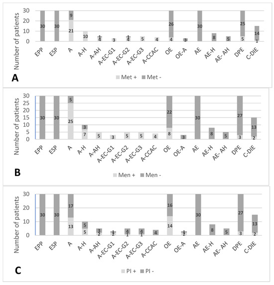 We grouped the EPP and ESP cases and created a control group (CG) and a pathological group (PG) in order to perform statistical tests between symptoms. Analyzing each two symptoms grouped according to symptomatic control group (CG+), asymptomatic control group (CG−), symptomatic pathological group (PG+) and asymptomatic pathological group (PG−), we obtained the following data: we observed differences between Met and SI [X2(3, 486 = 57.29), p < 0.05], between Met and VAS 0->1 [X2(3, 486 = 106.991), p < 0.05], between Met and VAS 2->3 [X2(3, 486 = 19.048), p < 0.05], between Met and VAS 4->5 [X2(3, 486 = 8.479), p < 0.05], between Met and VAS 8->10 [X2(3, 486 = 9.291), p < 0.05], between Men and SI [X2(3, 486 = 9.627), p < 0.05], between Men and VAS 0->1 [X2(3, 486 = 92.600), p < 0.05], between Men and VAS 2->3 [X2(3, 486 = 60.605), p < 0.05], between Men and VAS 4->5 [X2(3, 486 = 9.946), p < 0.05], between Men and VAS 6->7 [X2(3, 486 = 487.020), p < 0.05], between Men and VAS 8->10 [X2(3, 486 = 12.240), p < 0.05], between PI and VAS 0->1 [X2(3, 486 = 297.748), p < 0.05], between PI and VAS 2->3 [X2(3, 486 = 60.559), p < 0.05], between SI and VAS 0->1 [X2(3, 486 = 55.980), p < 0.05], between SI and VAS 2->3 [X2(3, 486 = 57.703), p < 0.05], between SI and VAS 4->5 [X2(3, 486 = 150.641), p < 0.05], between SI and VAS 6->7 [X2(3, 486 = 11.306), p < 0.05], between BD and VAS 0->1 [X2(3, 486 = 62.279), p < 0.05], between BD and VAS 2->3 [X2(3, 486 = 60.559), p < 0.05] and between BD and VAS 8->10 [X2(3, 486 = 557.301), p < 0.05]. Examining the categories according to symptoms, we observed cases associated with Met (Chart 1A), cases associated with Men (Chart 1B), cases associated with PI (Chart 1C), cases associated with SI (Chart 1D) and cases associated with BD (Chart 1E).
