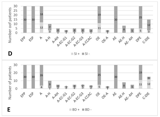 (A–E) Number of patients with Met (1A)/Men (1B)/PI (1C)/SI (1D)/BD (1E); EPP: endometrium proliferative phase; ESP: endometrium secretary phase; A: adenomyosis; A-H: adenomyosis with hyperplasia without atypia; A-AH: adenomyosis with hyperplasia with atypia; A-EC-G1: adenomyosis associated with endometrioid carcinoma G1; A-EC-G2: adenomyosis associated with endometrioid carcinoma G2; A-EC-G3: adenomyosis associated with endometrioid carcinoma G3; A-CCAC: adenomyosis associated with clear cell adenocarcinoma; OE: ovarian endometriosis; OE-A: ovarian endometriosis with cell atypia; AE: abdominal endometriosis; AE-H: abdominal hyperplastic endometriosis without atypia; AE-AH: abdominal hyperplastic endometriosis with atypia; DIE: deep infiltrative endometriosis; C-DIE: colorectal DIE; Met: metrorrhagia; Men: menorrhagia; PI: primary infertility; SI: secondary infertility; BD: bowel disorder.