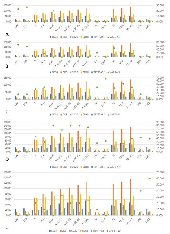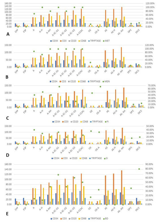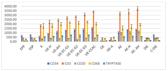 Distribution of mean values of CD34+ neoformation vessels and inflammatory system cells highlighting CD3+ T lymphocytes, CD20+ B lymphocytes, CD68+ macrophages and tryptase+ mast cells. The number of vessels exhibited overall differences between the studied groups regarding CD34: [F(15,242) = 450.601, p < 0.05]; CD3: [F(15,242) = 1970.346, p < 0.05]; CD20: [F(15,242) = 459.200, p < 0.05]; CD68: [F(15,242) = 417.152, p < 0.05]; tryptase: [F(15,242) = 457.346, p < 0.05]. CD: cluster of differentiation; EPP: endometrium proliferative phase; ESP: endometrium secretory phase; A: adenomyosis; A-H: adenomyosis with hyperplasia without atypia; A-AH: adenomyosis with hyperplasia with atypia; A-EC-G1: adenomyosis associated with endometrioid carcinoma G1; A-EC-G2: adenomyosis associated with endometrioid carcinoma G2; A-EC-G3: adenomyosis associated with endometrioid carcinoma G3; A-CCAC: adenomyosis associated with clear cell adenocarcinoma; OE: ovarian endometriosis; OE-A: ovarian endometriosis with cell atypia; AE: abdominal wall endometriosis; AE-H: abdominal wall hyperplastic endometriosis without atypia; AE-AH: abdominal wall hyperplastic endometriosis with atypia; DIE: deep infiltrative endometriosis; C-DIE; colorectal deep infiltrative endometriosis.