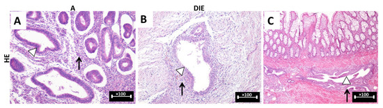 (A–C): Morphological aspects of E/A lesions in classical HE staining. (A): Endometrial glands (white arrowhead) and peri-glandular stroma (black arrow) are visualized in the myometrial structure; (B): DIE lesions—ectopic presence of endometrial glands (white arrowhead) in the peritoneal structure with stromal and inflammatory infiltrate (black arrow) in the sub-mesothelial connective tissue; (C): C-DIE lesions, endometrial glands (white arrowhead) are seen in the colonic submucosa structure, [HE staining, ×100]. HE: hematoxylin–eosin; A: adenomyosis; DIE: deep infiltrative endometriosis; C-DIE: colorectal deep infiltrative endometriosis.