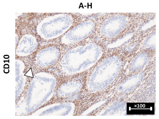 Labeling of stroma (white arrowhead) in A-H. Immunostaining with anti-CD10 antibody, [×100]. A-H: adenomyosis with hyperplasia without atypia; CD10: cluster of differentiation 10.
