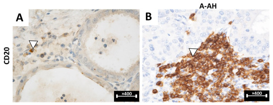 (A,B): Immunohistochemical aspects of E/A lesions stained with anti-CD20 antibody. M: OE lesion immunolabeled with anti-CD20 antibody highlighting B lymphocytes (white arrowhead), [×400]; N: A-AH lesion immunolabeled with anti-CD20 antibody highlighting B lymphocytes (white arrowhead), [×400]. OE: ovarian endometriosis; A-AH: uterine endometriosis with hyperplasia with atypia.