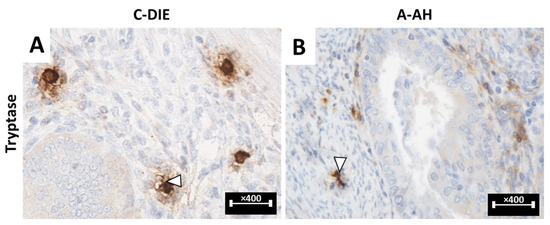 (A,B): Immunohistochemical aspects of E lesions stained with anti-tryptase antibody. (A): C-DIE lesion immunolabeled with anti-tryptase antibody highlighting mast cells (white arrowhead), [×400]. (B): A-AH colorectal DIE lesion immunolabeled with anti-tryptase antibody highlighting mast cells (white arrowhead), [×400]. C-DIE: colorectal deep infiltrative endometriosis; A-AH: uterine endometriosis with hyperplasia with atypia.