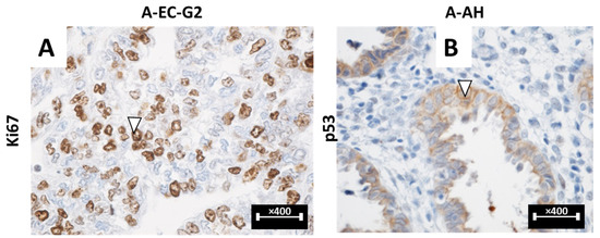 (A,B): Immunohistochemical aspects of E/A lesions stained with anti-Ki67/p53 antibody. (A): A-EC-G2 lesion immunolabeled with anti-Ki67 antibody highlighting dividing cells (white arrowhead), [×400]. (B): A-AH lesion immunolabeled with anti-p53 antibody (white arrowhead), [×400]. A-EC-G2: uterine endometriosis associated with endometrioid carcinoma G2; Ki67: marker of proliferation Ki 67; p53: tumor protein 53.