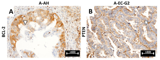 - Apostolou, G.; Apostolou, N.; Biteli, M.; Kavantzas, N.; Patsouris, E.; Athanassiadou, P. Utility of Ki-67, P53, Bcl-2, and Cox-2 Biomarkers for Low-Grade Endometrial Cancer and Disordered Proliferative/Benign Hyperplastic Endometrium by Imprint Cytology. Diagn. Cytopathol. 2014, 42, 134–142. [Google Scholar] [CrossRef]