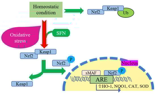 Cellular interaction between Nrf2 and SFN. Keap1 inhibits Nrf2 degradation in homeostatic conditions by promoting Nrf2 ubiquitination (Ub) in the cytoplasm. During oxidative stress, Nrf2 phosphorylates and translocates into the nucleus to promote antioxidant response element (ARE) expression, as well as induces gene expression of HO-1, NQO1, CAT, and SOD. In this regard, SFN acts as a Nrf2 activator that promotes the dissociation of Nrf2 from its negative regulator Keap1 and upregulates this reaction comprehensively.