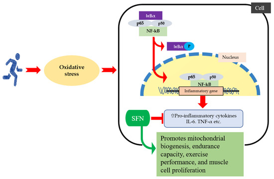When oxidative stress increases during exercise, IκBα is phosphorylated, and an released activated NF-κB that entered into the nucleus, which increases production of pro-inflammatory cytokines and chemokine expression. SFN intervention improves exercise performance by reducing reactive oxygen species, inflammatory cytokines, and chemokines, as well as inactivated NF-ĸB signaling pathway.