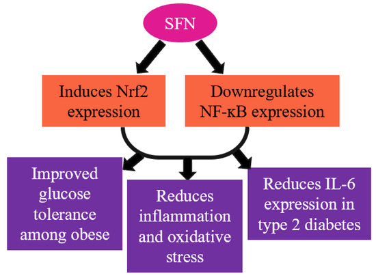Considering broccoli sprout powder (BSP) to be a rich source of SFN, a randomized, double-blind and placebo-controlled clinical trial was conducted among type 2 diabetic patients. A four-week intervention of BSP (the SFN content of BSP was determined to be ~22.5 μmol/g) resulted in the lowering of the inflammatory mediator IL-6 concentration in type 2 diabetic patients compared to the control [89]. Additionally, SFN administration (100 μmol per kg/body weight) also upregulates the insulin signaling pathway, as well as improves the glucose tolerance (Figure 3) [90]. In 2021, a clinical trial was conducted with type 2 diabetes mellitus (T2D) patients with an intervention of aerobic resistance training and broccoli supplementation (10 g/day; 22.5 mmol/g SFN) for 12 weeks [91]. They reported that broccoli supplementation with exercise training improved the lipid profile, body composition variables, and insulin level among the diabetes group compared to broccoli supplementation alone or exercise training alone [91]. Additionally, several studies reported that SFN intervention can reduce obesity through various mechanisms like the browning of fat, altering leptin resistance, and promoting lipolysis [92,93,94,95]. However, SFN showed no anti-inflammatory or antioxidative effects in patients with chronic kidney diseases (CKDs). A cross-over, randomized, double-blind study was performed with CKD patients, providing 150 μmol of SFN for two months and showing no effect in terms of Nrf2 and NF-ĸB expression or inflammatory markers [96]. An acute toxic dose of SFN (300 mg/kg body weight) causes pro-convulsion, hypothermia (150–300 mg/kg), impaired motor coordination (200–300 mg/kg), and reduced muscle strength (200–250 mg/kg) [97].