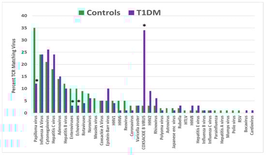 Percentage of T-cell receptor (TCR) sequences from type 1 diabetes mellitus (T1DM) patients that mimic 37 common human viruses compared with the percentage mimicked by TCRs from healthy individuals. Asterisks (*) indicate that the difference is statistically significant after Bonferroni correction (see Appendix A, Table A1). HHV = human herpes virus; HTLV = human T-lymphotropic virus; RSV = respiratory syncytial virus.
