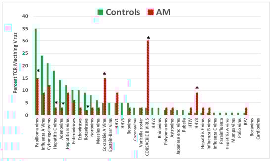 The results comparing TCRs derived from AM patients (henceforth “AM TCRs”) also displayed a significantly increased incidence for coxsackievirus (both A and B, in this case), as well as for human herpes virus type 8 (HHV8). Once again, the incidence of papilloma virus matches was significantly decreased, as were the incidences of hepatitis C, adenoviruses, and rotaviruses (Figure 2). These results again appear to confirm the previously reported association of coxsackievirus infections as triggers for AM and suggest that HHV8 may also play such a role.
