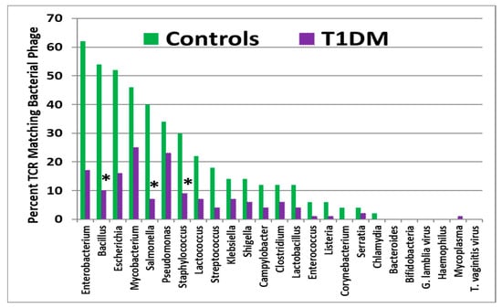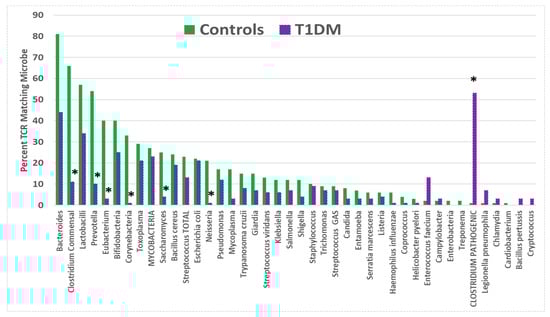 T1DM TCRs displayed a significantly increased rate of incidence over the values expected from healthy control TCRs for only one of the bacteria tested: pathogenic Clostridia species (C. perfringens, C. difficile, C. clostridioforme, C. tetani, and C. botulinum) (Figure 4). This result would seem to confirm a previous report that Clostridia are possible triggers for T1DM []. As in the case of the viruses, a number of mainly commensal bacteria exhibited significantly lower-than-expected rates of T1DM TCR matches; these included commensal Clostridia, Eubacteria, Prevotella, and Corynebacteria. Thus, TCR usage was shifted from that which was displayed by healthy individuals.