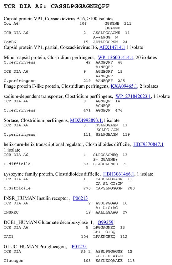 T1DM TCRs that mimic coxsackieviruses and Clostridia also mimicked T1DM target proteins, including insulin, the insulin receptor, glucagon, the glucagon receptor, GAD-1, and PTPRN (PTP-Ia). The results presented here, as well as those of previous research [], have shown that coxsackieviruses mainly mimic the insulin receptor, while Clostridia mainly mimic insulin, GAD-1, and PTPRN. However, anti-coxsackievirus antibodies have been reported to cross-react with GAD-1 as well [,]. Thus, TCR sequences from T1DM patients mimic coxsackieviruses, Clostridia, and the main autoantigenic proteins targeted in the disease.