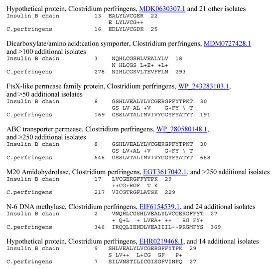 Evidence for an immune response to coxsackieviruses in T1DM patients is legion and is not further reviewed here (e.g., [,,,,,,,]). Only one study has ever looked for evidence of enhanced immunity to Clostridia in T1DM, and it found that antibodies recognizing Clostridia were present in high titers in most human T1DM sera tested []. This result is consistent with Clostridia having the highest number of proteins with similarities to insulin of any bacterium or virus currently listed in the UniProtKB database (Figure 7 and Figure 8 and []). Furthermore, the observation that TCR sequences expanded in T1DM patients mimic Clostridia and coxsackieviruses is consistent with a previous study demonstrating that antibodies against coxsackieviruses cross-react with the insulin receptor, while antibodies against Clostridia cross-react with insulin [].