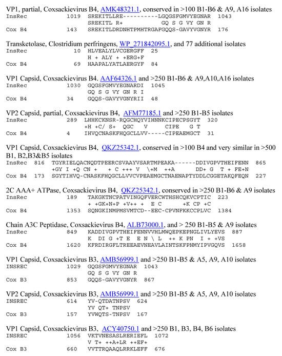 Similarities between coxsackievirus B3 (Cox B3) and the human insulin receptor (INSREC). UniProtKB identifiers are underlined.