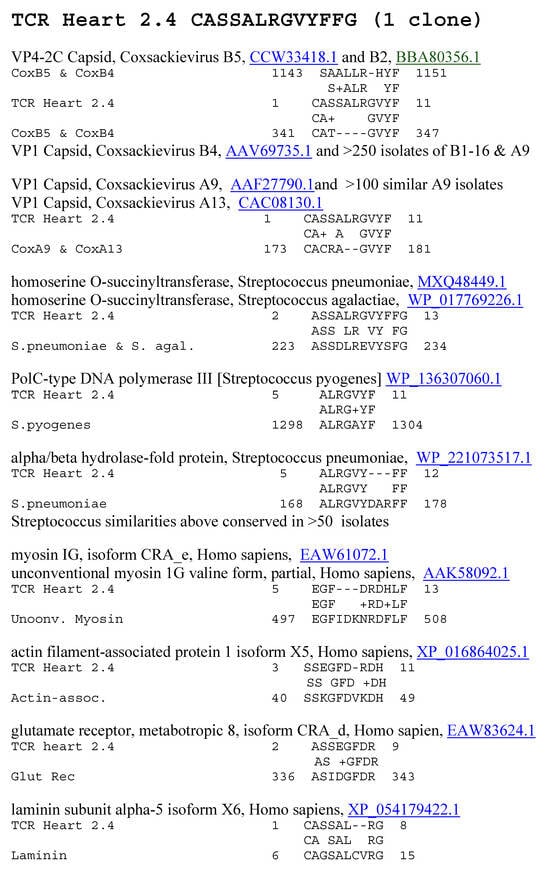 Increased mimicry between AM TCRs, coxsackieviruses, and Streptococci was associated with the mimicry of human heart proteins, including myosin, laminin, actin, and actin-associated proteins such as dynactin; and basement membrane collagens. Previous research had demonstrated that Streptococcal antigens mimic myosin and laminins [,,,], and coxsackievirus antigens mimic mainly actin and collagens [,]. However, both coxsackieviruses and Streptococci proteins mimic some shared myosin sequences so that there is cross-reactivity between antibodies against coxsackievirus and Streptococci [,]. Actin-associated proteins such as dynactin were also found to mimic coxsackievirus but not Streptococci. In sum, TCR sequences from AM patients mimic coxsackieviruses, Streptococci, and the main autoantigenic proteins targeted in the disease.
