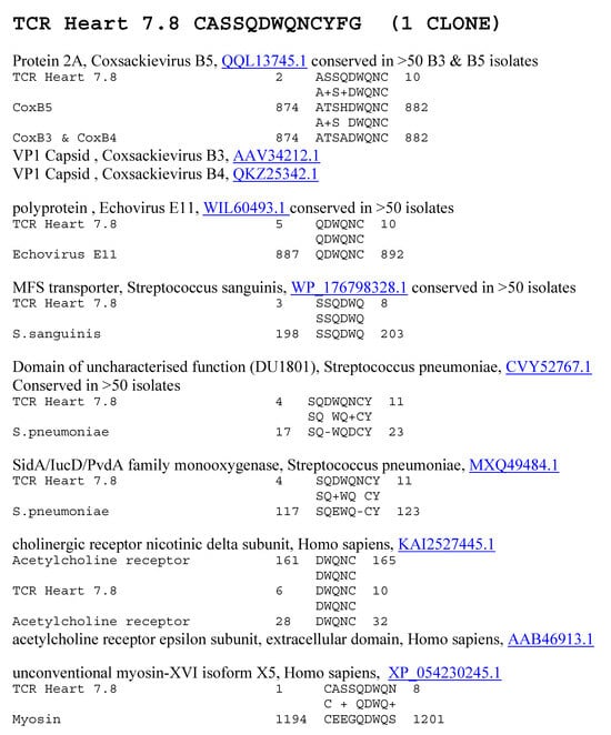 Significant similarities between the TCR Heart 7.8 sequence and the antigens listed in Table 2 above. Underlined numbers are the UniProtKB identifiers.