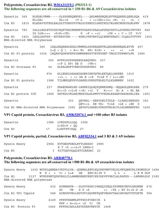 Sequence similarities between coxsackievirus B3 and human dynactin revealed by LALIGN. UniProtKB identifiers are underlined.