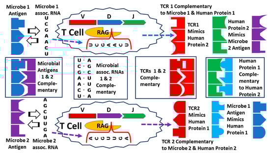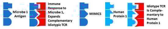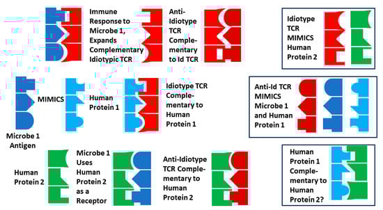 Several additional explanations for the TCR–antigen mimicry results are possible that build on various aspects of MMT and bystander activation and address their limitations with regard to the data produced here. The first derives from Plotz’s anti-idiotype theory of AD [,] in combination with molecular mimicry. Assume that microbe 1 expresses a dominant antigen that mimics some human protein 1. The antigen will expand an idiotypic TCR that will also recognize human protein 1. Assume further that the microbial antigen is complementary to a second human protein (protein 2) that it uses as a cellular receptor for targeting its infection. If the idiotypic TCRs are expressed at high enough levels for enough time, they may elicit an anti-idiotypic set of TCRs. These anti-idiotypic TCRs will be complementary not only to the idiotypic TCRs but also to human protein 2 (the microbial receptor). The result will be that the idiotypic and anti-idiotypic TCRs will be complementary, neutralizing each other; the idiotypic TCRs will mimic protein 2 (the microbial receptor); the anti-idiotypic TCRs will mimic both the microbial antigen and human protein 1. Logic dictates that human proteins 1 and 2 will also be complementary to each other (Figure 15).