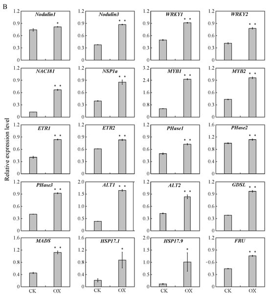 2.6. Statistics of Differentially Expressed Genes in the Root Systems and Root Nodules of the Control and GmAGL82-Overexpressing Plants