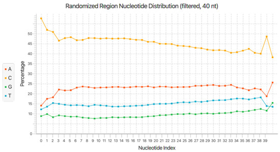 In order to elucidate the 76 bp aptamer sequences within the MPS data, significant data manipulation was required. Any regions of DNA associated with the MPS library preparation, such as the addition of indexes and any sequencing artefacts that may be present within the dataset, were removed. Firstly, Galaxy was used with an automated, custom Cell-SELEX pipeline that is capable of processing FASTQ files (both forward and reverse read files) that were generated as a result of MPS. Stepwise information for this custom pipeline has been reported in 2021 by Gooch et al. [25]. In order to validate results obtained from the Galaxy workflow, AptaSUITE was employed in order to gain further insight into features of the pools, such as base distribution and enrichment. Figure 1 shows the randomised region (40 base) nucleotide distribution by base. This shows that an average of 46% of the pool comprised cytosine, which indicates that the target site on the RBC has a strong interaction with cytosine. Despite showing a lower percentage of guanine in the pool, Section 2.3 below outlines the predicted G-quadruplex-forming regions within the enriched candidates.