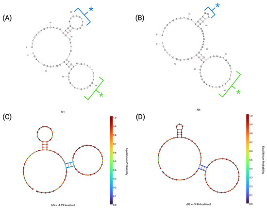 Secondary structure predictions. Predicted secondary structures of aptamers using Mfold software of (A) N1 and (B) N4 [35]. On each aptamer structure, the 5′ loop structure is indicated by a blue asterisk and the 3′ loop structure is indicated by a green asterisk. NUPACK equilibrium probabilities plots using NUPACK software are shown for (C) N1 and (D) N4 [36].