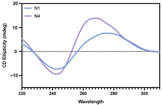 Circular dichroism spectra. CD spectra of both N1 (blue) and N4 (purple) aptamers in their folded, unbound state.