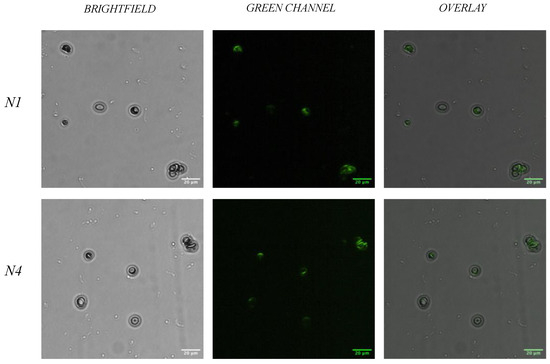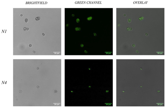 When considering the use of N1 and N4 in a forensic setting, it is vital to assess the binding capabilities of the aptamers within whole human blood. Therefore, a second fluorescent bioassay was performed as above, however, utilising whole blood opposed to the isolated RBCs. Briefly, each 6-FAM labelled aptamer solution (at 20 μM) was added to whole blood and left to incubate for 15 min. Post incubation, the solution was centrifuged to remove unbound sequences, and washed (×3) prior to visualisation on a slide. As demonstrated in Figure 5, both N1 and N4 retain the ability to bind to red blood cells when in the presence of human serum and other components of whole human blood during incubation. Whilst a minor decrease in the fluorescent signal can be observed on the surface of the RBCs when compared to incubation with RBC alone, the ability to detect a signal is sufficient to demonstrate the binding capabilities of both N1 and N4 in whole blood. The reported time for aptamer degradation by human nucleases varies depending on the structure and concentration of the aptamer [45,46]. More tightly folded aptamer structures will display a greater resistance to degradation due to limited solvent exposure, with shorter aptamers also displaying a quicker degradation [45,47]. When considering the application of these aptamers within a biosensor for the real-time detection of human blood, a signal output should be generated within minutes; thus, the level of binding seen in Figure 5 is deemed acceptable given that a signal was still produced after an incubation time of 15 min. A range of aptamers designed for various therapeutic targets have demonstrated their ability to bind to their targets and, thus, their stability within human serum [48,49,50]. Future optimisation of the N1 and N4 aptamers could look at modifications to protect them from nuclease hydrolysis, through methods such as linker modification or sugar backbone modifications [51,52]. Prior to the incorporation of these aptamers within a biosensor for use within a forensic workflow, additional validation studies would be completed to further assess stability and performance under various environmental and biological conditions.