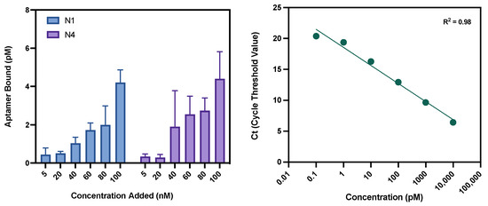 By using qPCR as a binding assay, the binding of an aptamer to a target can be quantified. qPCR is a sensitive technique that has been considered to be the ‘gold standard’ for the quantitative analysis of nucleic acids and has had successful use within aptamer binding characterisation studies to monitor dose-dependent binding [53,54,55,56]. In order to utilise this assay for N1 and N4, a range of concentrations of each aptamer was prepared: 100 nM, 80 nM, 60 nM, 40 nM, 20 nM and 5 nM. All reactions were conducted in triplicate. After incubation with human RBCs, the bound aptamers were cleaved from the surface and quantified using qPCR. Utilising the obtained average threshold cycles (Ct) from the aptamer control samples, a standard curve was established (Figure 6). To validate the standard curve, a positive control was used of a 50 pM solution of aptamer. This then correctly calculated the aptamer concentration from the obtained Ct generated, validating the method for use with N1 and N4. Both N1 and N4 display dose-dependent binding to RBCs, as demonstrated in Figure 6. Both aptamers showed the general trend of an increased concentration of aptamer bound to the RBCs as the concentration of aptamer added increased. A total of three healthy donors were used for this bioassay, with blood donation being pooled prior to RBC isolation. This ensures that a variety of RBC variations are present within the pool, capturing a range of possible surface proteins and, hence, possible binding sites.