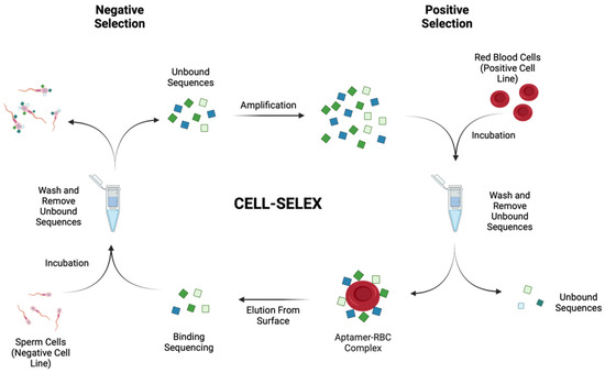 Cell-SELEX with negative selection. A schematic representation of the Cell-SELEX process used to generate high-affinity aptamers against human red blood cells. Negative selection rounds were conducted from round 7+, using isolated human sperm cells as a control cell line. Green and blue squares represent the randomised oligonucleotide library.