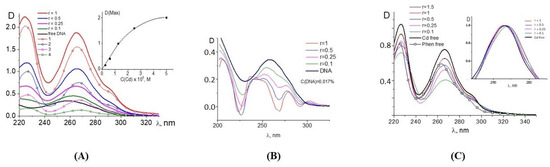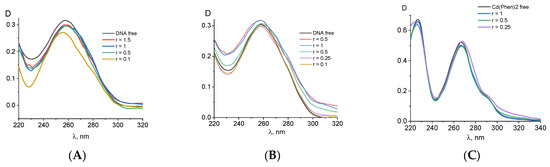 Figure 4A,B). It follows that, upon binding, the spectral properties of phenanthroline ligands change almost identically for both compounds. At the same time, spectral changes in complexes are greater for Cd(Phen)2 compared to Cd(Phen)3 (
