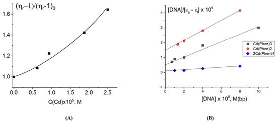 Figure 5B). The binding is stronger than observed for the Cd(Phen)2 interaction with DNA. We can assume the coordination binding of a compound to DNA with the intercalation of 1,10-phenanthroline. This is possible when a complex ion penetrates to the major groove of DNA. Then, the cadmium can coordinate with N7 guanine, and 1,10-phenanthroline can intercalate. DNA intercalation can involve the insertion of one intercalating moiety (mono-intercalator) and two intercalating moieties (bis-intercalator). From a comparison of the dependence of the viscosity of DNA solutions on r for compounds Cd(Phen)2 and 2Cd(Phen)4, it follows that only one of the two complex ions of the 2Cd(Phen)4 compound interacts with DNA. In addition, the presence of two independent types of binding (the formation of a coordination bond and the intercalation of 1,10-phenanthroline) can be assumed. The increase in viscosity of DNA solutions with 2Cd(Phen)4 is less than with Cd(Phen)2, but the saturation of binding is observed at the same r value.