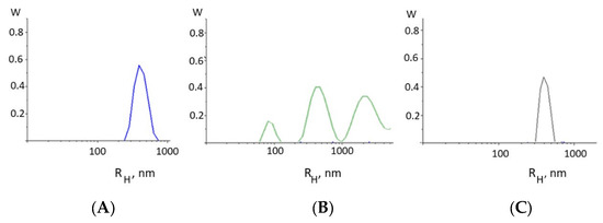 Figure 3A), the results demonstrate the presence in the solution of particles with a hydrodynamic radius of 350 ± 50 nm, which corresponds to the mode responsible for the translational motion of the macromolecule as a whole.