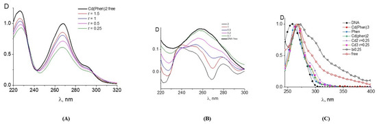 Figure 1C). Naturally, in such a calculation, we assume that the absorption of DNA in a complex coincides with that of free DNA. The hypochromic effect is most noticeable in solutions with high DNA concentrations (small r value) and with an excess of binding sites for the compounds on DNA. We believe that, in this case, the appearance of stacking interactions of chromophores in the complexes can be observed. This may be either the result of the intercalation of 1,10-phenanthroline between DNA bases or the formation of a complex when different 1,10-phenanthroline ligands form stacked associates. Note that free 1,10-phenanthroline has another spectral band (see