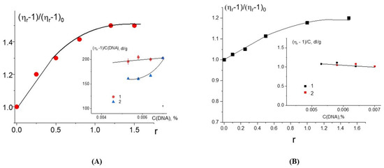 24]. Indeed, the intercalating ligand can be inserted in such a way that the neighboring DNA base pair does not participate in the intercalation. Hence, we can conclude that the increase in the intrinsic viscosity of DNA due to the elongation of the macromolecule during intercalation at the maximum possible binding without a change in the DNA rigidity according to the Flory formula should not exceed 80%. For the reduced viscosity of DNA solutions, this change may be different.