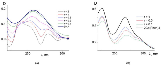 Figure 1B) with the assumption that the spectral properties of the cadmium compound remained unchanged during the complex formation (which is incorrect). Indeed, the obtained DNA spectra demonstrate an unrealistic shape. Such spectra may be obtained due to a decrease in the absorption of Cd(Phen)3 in the complexes. The hypochromic effect occurs in two bands, and this can produce the observed result.