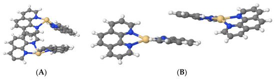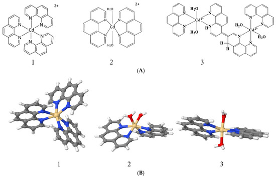 Figure 5A). Thus, the compound Cd(Phen)2 does not form a coordination bond with DNA. The intercalation model with the location of a compound in the minor or major groove of DNA between two negatively charged phosphates that neutralize the charge of the cadmium may be offered. It should be emphasized once again that, despite the great similarity in the spectral changes of Cd(Phen)2 and Cd(Phen)3 in complexes with DNA, the difference in binding constants suggests that a stronger binding is observed for Cd(Phen)2. Indeed, in addition to the electrostatic binding, the intercalation of 1,10-phenanthroline occurs.